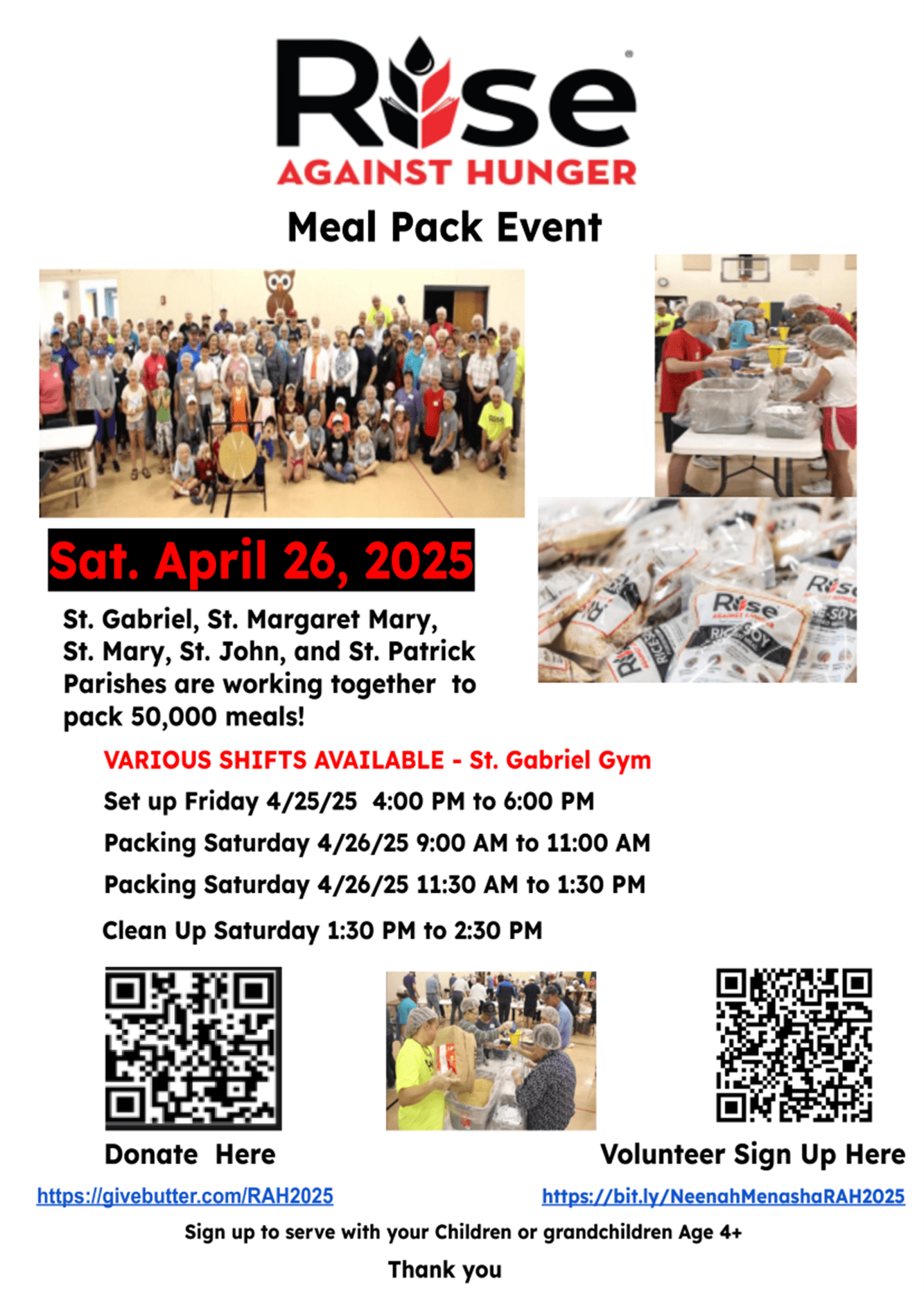 Thank you all for a job well done Neenah-Menasha Catholic Parishes and SMCS. Together we raised the necessary funds and 288 volunteers proceeded to pack 50,112 meals for our global neighbors in need.